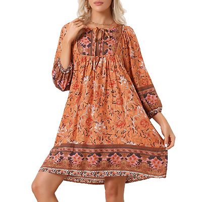 Women s Boho Floral Print Dress 2024 Summer Casual 3 4 Sleeve Loose Fit Beach Dresses